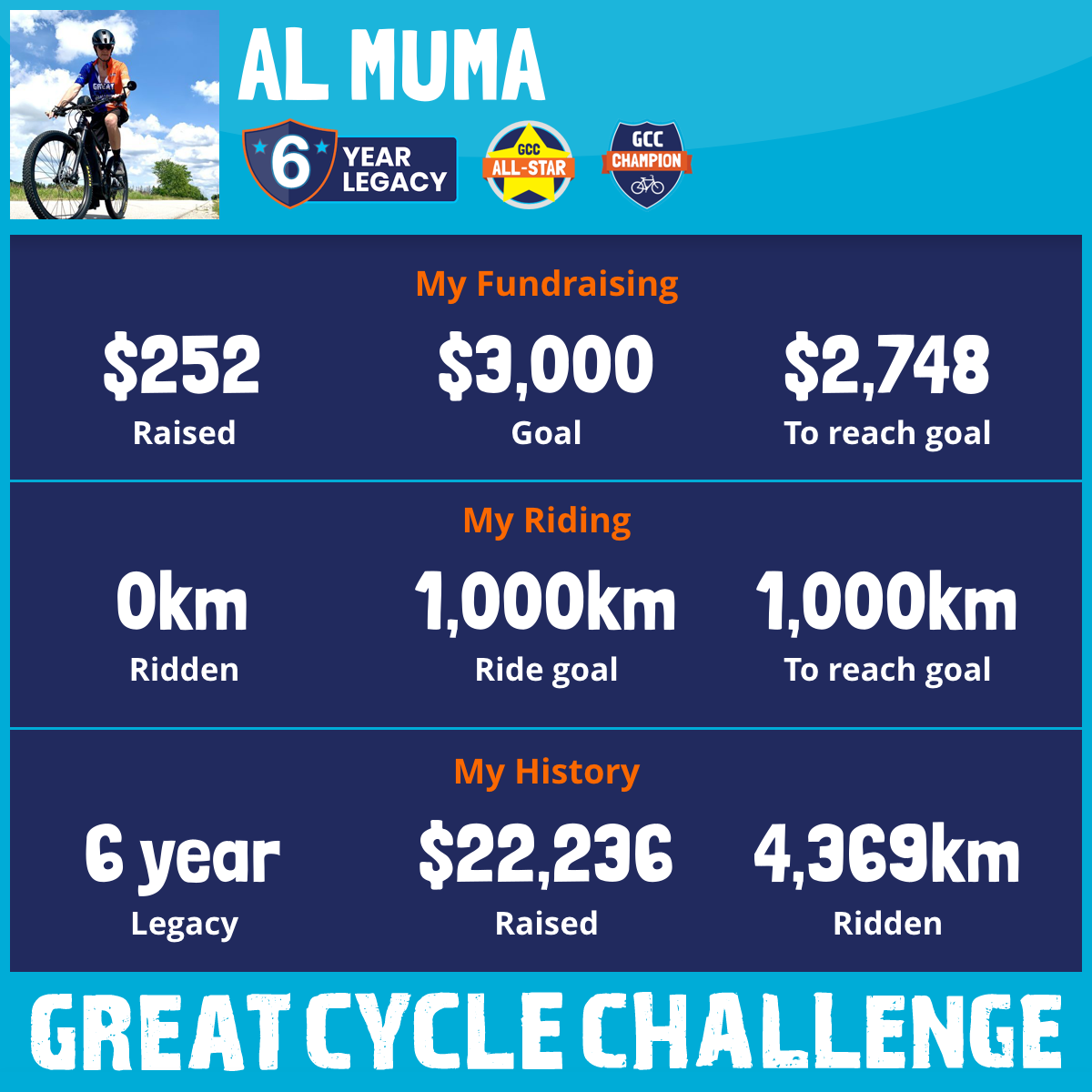 I'm back on my bike again this year and looking forward to pedaling my way past my goal this year and raising funds to help fight childhood cancer. This will certainly be a challenge for me, and I know that many of the 1,400+ children who are diagnosed with cancer every year would love to be able to do something like this, but unfortunately they often struggle just to get out of their hospital bed. Cancer is the biggest killer of children from disease in Canada and so I ride for them. Those children are facing challenges that I cannot even imagine yet they push on with the hope to be able to one day ride in the Great Cycle Challenge themselves..... a dream and hope that they strive for.