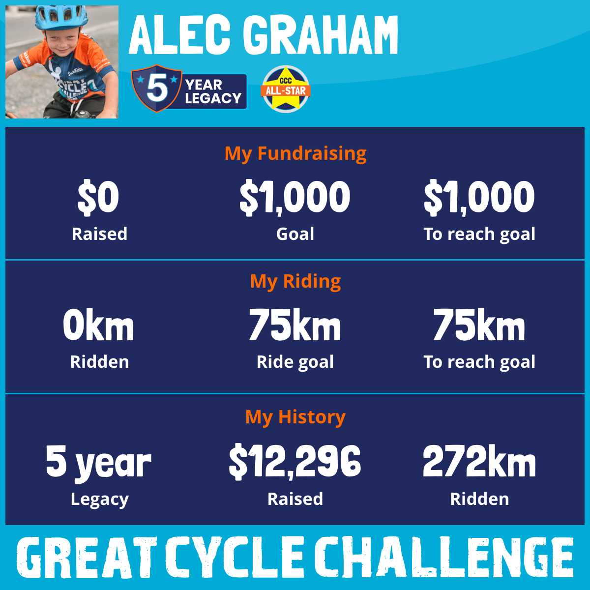 Join me, a determined nine-year-old boy, on my Great Canadian Cycle Challenge as I pedal my way to make a difference in the lives of sick kids! I believe that together, we can bring smiles and hope to those who need it the most. Every stroke of my tiny pedals will be dedicated to raising funds for children battling illness.