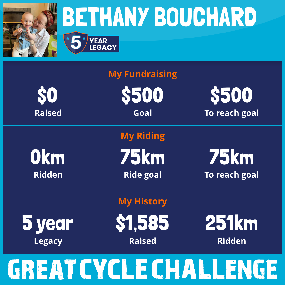 As a survivor of childhood cancer, I grew up not knowing if I’d live long enough to experience adulthood, let alone parenthood. Today, I ride for my daughter, who I was blessed to have against all odds. I ride in memory of my dear friend Kimmy, who passed away just before we were to begin post-secondary with our friends. And I ride for every brave child I met as a camper at Camp Oochigeas, whose strength and spirit have stayed with me.