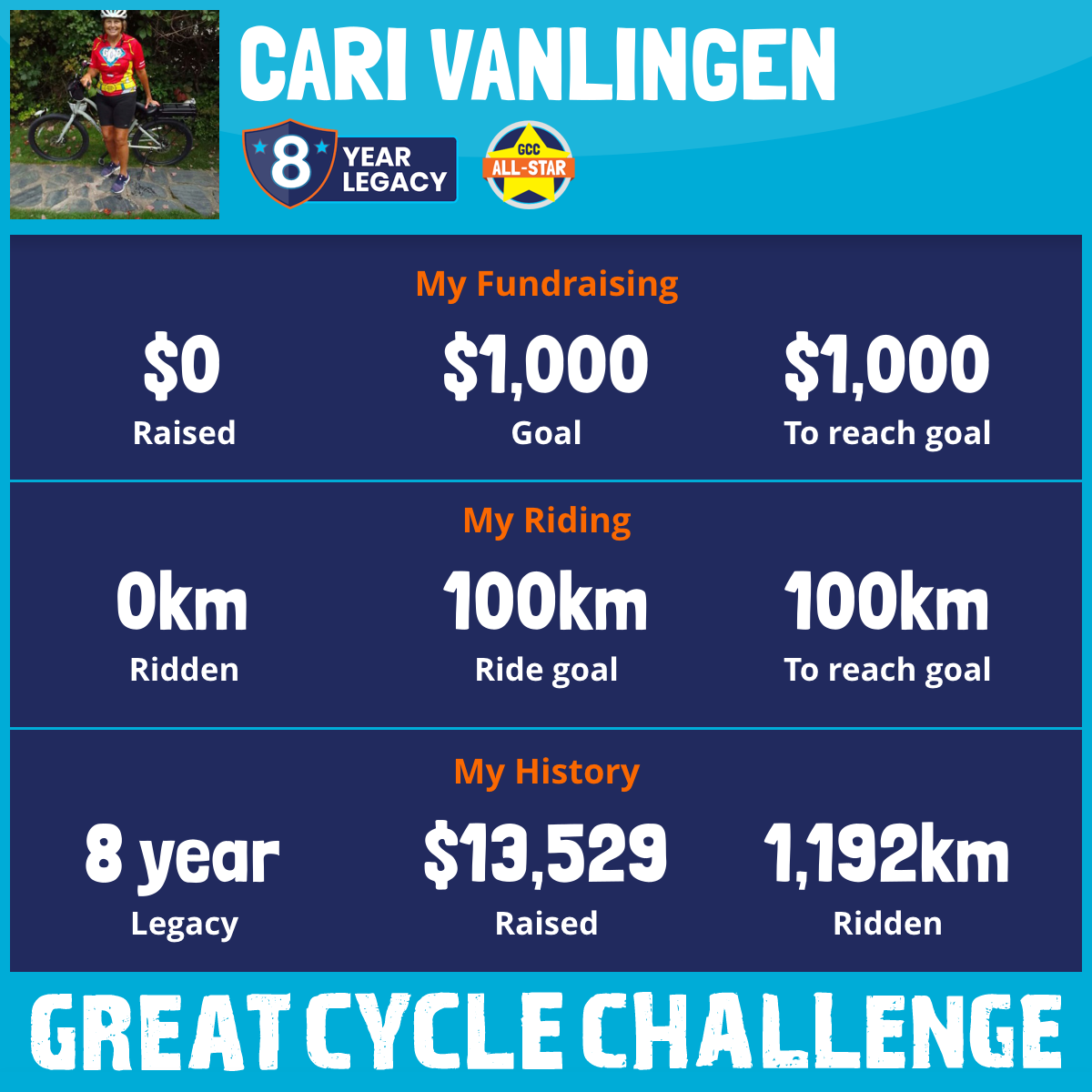 This August, I am taking part in the Great Cycle Challenge to fight kids' cancer! This is the 16th year anniversary of when our daughter was diagnosed with cancer and went through that horrific ordeal. If she could go through that I can certainly go through riding 150 km to help raise funds for childhood cancer.