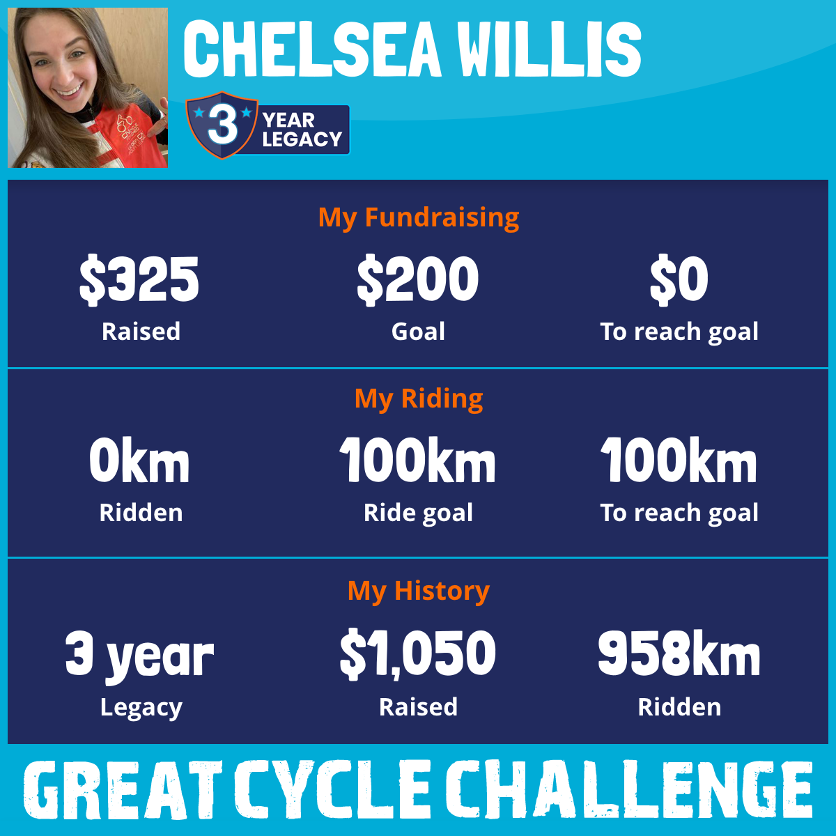 I am riding 100 km in memory of Carrie. Please sponsor me and support my challenge to fight kids' cancer and save little lives.