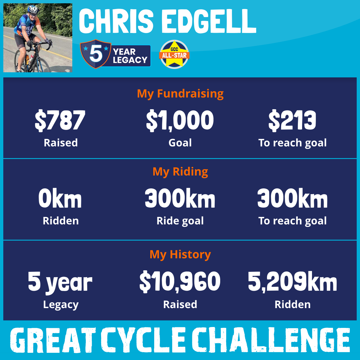 This August, I am taking part in the Great Cycle Challenge to fight kids' cancer! My cycling efforts were restricted in 2024 because I broke my hip in July 8th 2024. None the less it is nothing compared to the fight the kids battling cancer have in their lives. I am continuing in good health to raise funds for kids with cancer through the charitable org called the GREAT CYCLE CHALLENGE. JOIN ME IN THIS EFFORT. SINCERELY CHRIS EDGELL