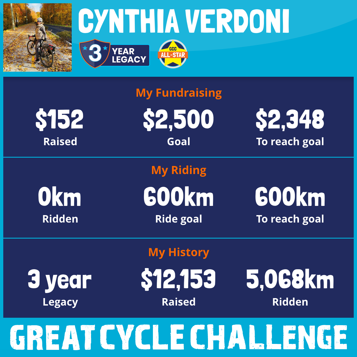 I am riding for a friend/work colleague that lost his precious daughter to cancer in her 20s, way to soon as her life was commencing. Being a mother of 3 as well as a mother to all their friends I could not imagine the grief of losing a child. I am riding for all the people out there that have felt the loss of a loved one to this terrible illness.