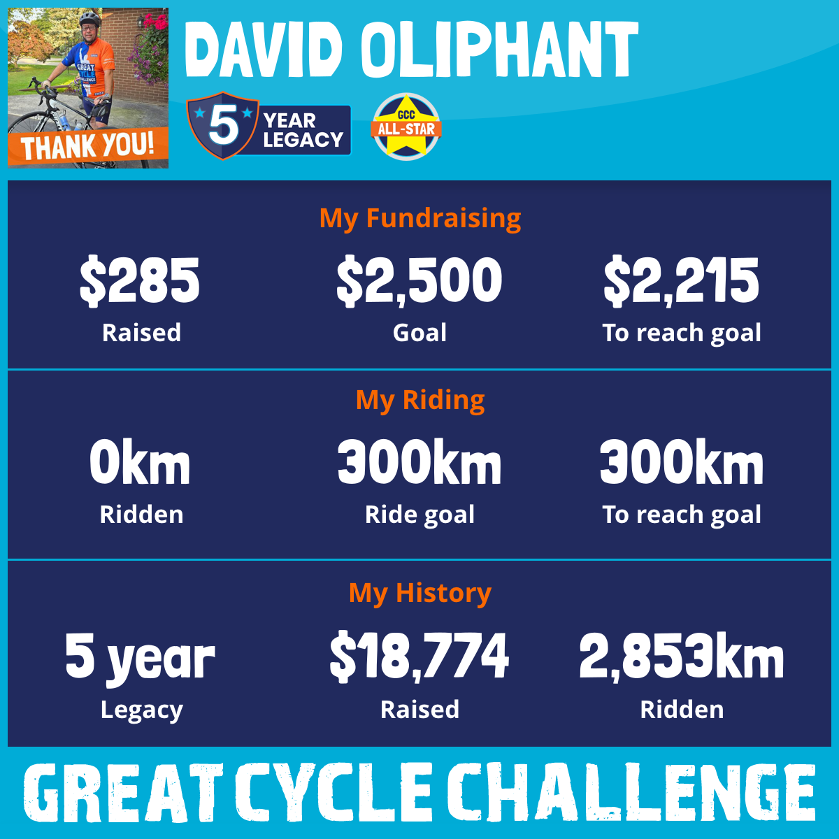 For my 5th year, this August, I am taking part in the Great Cycle Challenge to fight kids' cancer! My goal is to ride 500Kms for the month of August. With your help, together we have been able to raise almost $20,000.00 for this worthy cause since 2021.