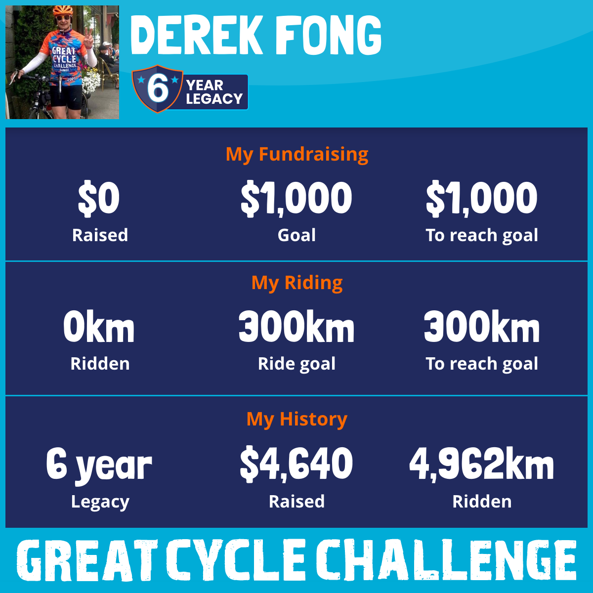 I am riding 300 km in memory of my loved one, Derek Fong. Please sponsor me and support my challenge to fight kids' cancer and save little lives.