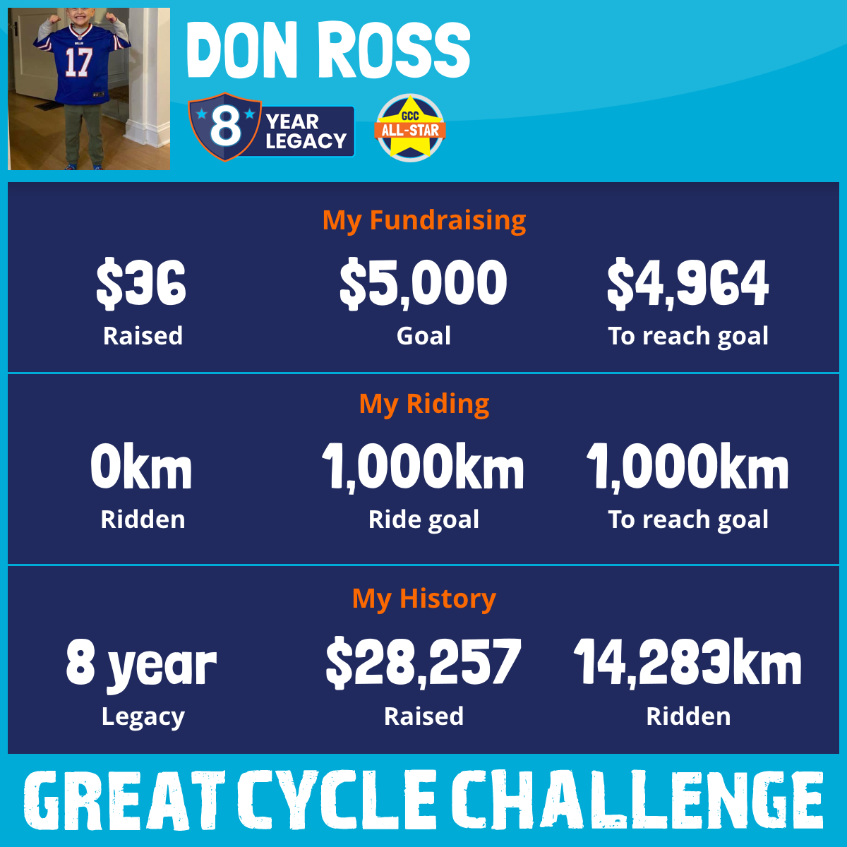 This will be my 8th year taking part in the Great Cycle Challenge to fight kids' cancer! Why? Because right now, over 1,700 children are diagnosed with cancer every year, and it's the biggest killer of children from disease in Canada. 3 young lives are lost every week like the brave young boy who rides with me in my heart , 6 year old Griffin Bell from Ottawa ( June 26, 2017 - March 18, 2024 ) . Every 2 minutes a child is diagnosed with cancer around the world. My wife & I sometimes see these young children when we are at Princess Margaret Cancer Centre & Toronto Western where she's been receiving ongoing care for Stage 4 metastatic breast cancer. We’re so grateful for the life saving research being done there and for the care & treatment she receives at UHN in Toronto & at BGH Oncology in Belleville. Hospitals like Toronto Sick Kids and CHEO in Ottawa are doing incredible work with children dealing with cancer. As any parent or grandparent like us would say.....all kids should be living life, not fighting for it . So I'm raising funds through my challenge to ride each day all year long to help these kids and support Sick Kids Foundation . This helps them continue their work in developing treatments and finding a cure for childhood cancer. Please support me by making a donation to give these brave kids the brighter futures they deserve.Your support will change little lives. Thank you so much! #GriffinMyHeartForever #RidingForHeather #FightLikeAKid #thegldnsociety