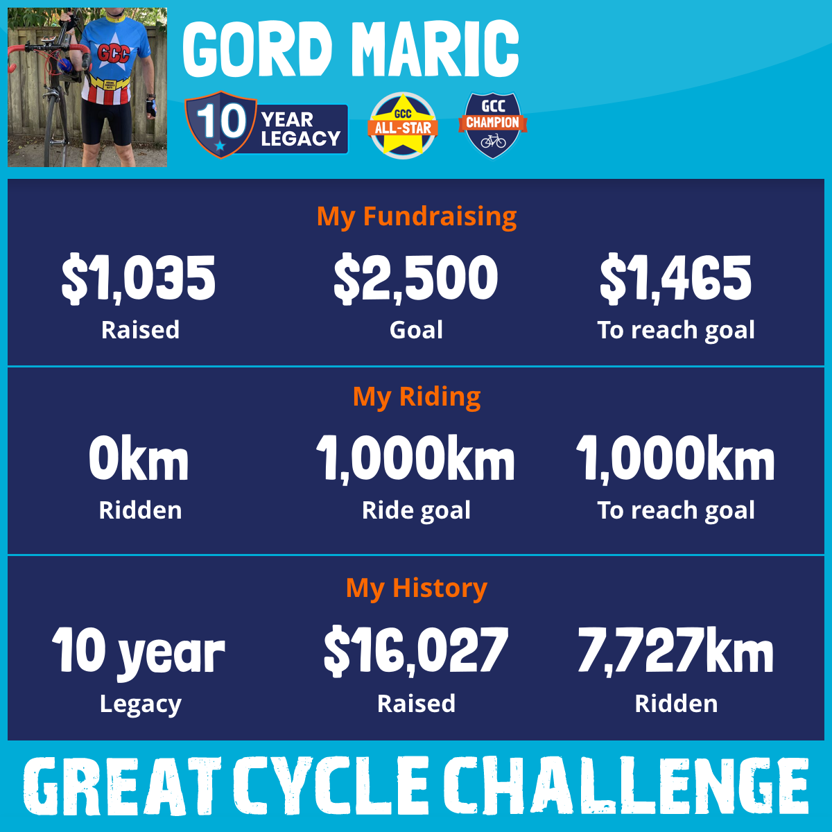 Seven years ago I started this ride for very personal reason to motivate myself to get on the bike and the worthy charity to kept me motivated and moving. My personal challenge worked, and I've raised a lot of money to helped kids and kept riding and motivating others. I continue again this year in in August, to take part in the Great Cycle Challenge to fight kids' cancer!