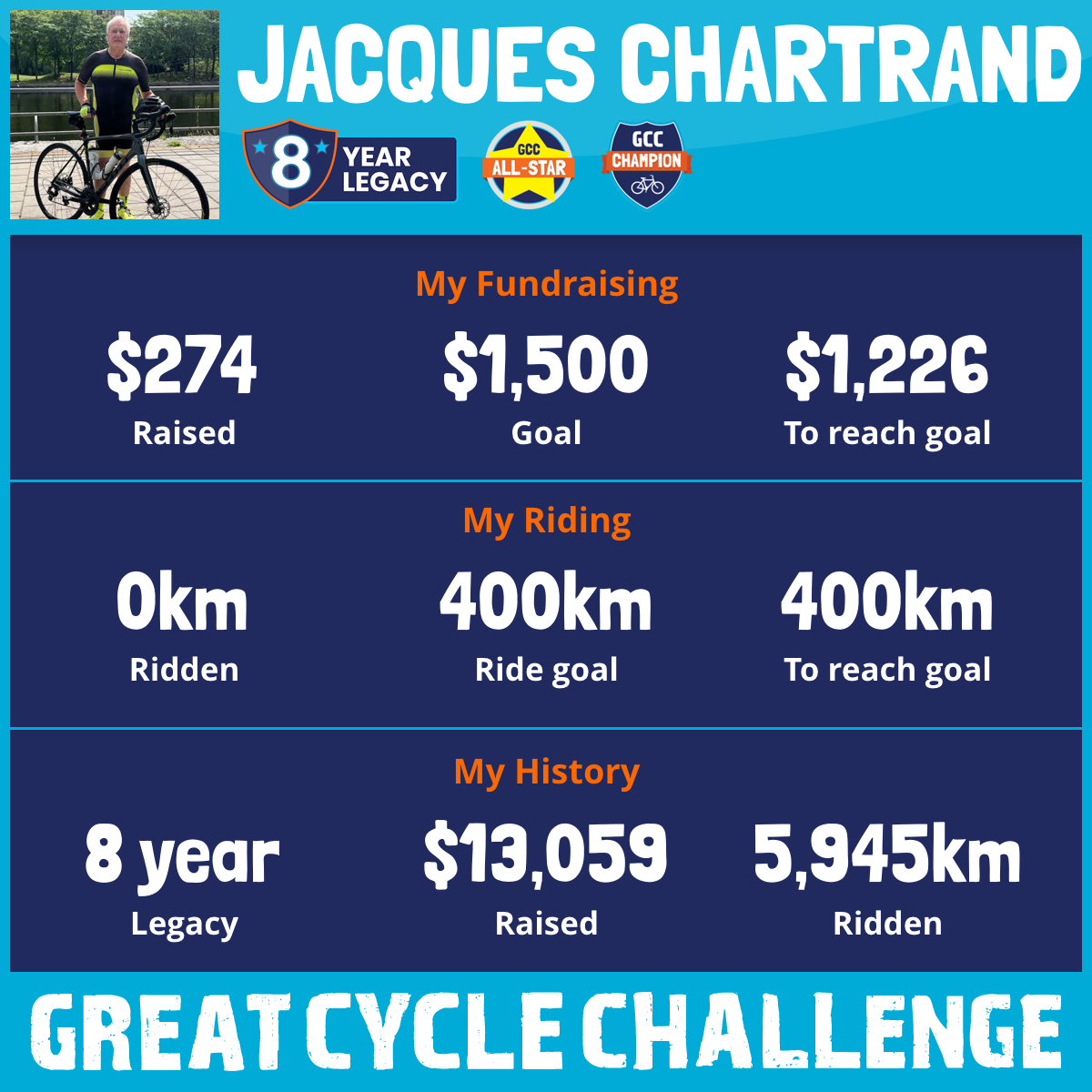 This is my 8 th year riding for this fundraising and I encourage you to support this cause to beat cancer with children, thank you in advance for your support and your generosity, amicably, Jacques