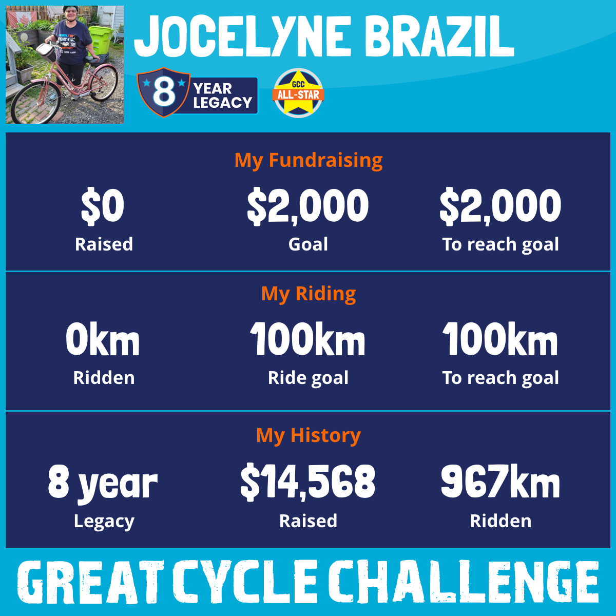 This year I am riding in the Great Cycle Challenge in honour of my sister, Michele, who we lost to cancer. From date of diagnosis to date of death was 34 days. She was an adult and I am so proud to call her sister. No child should have to battle Cancer, so please help me to help fight Kids' Cancer by helping me reach my goal of $2,000.00. If we can cure cancer in children then maybe there won't be as many adult deaths due to cancer.