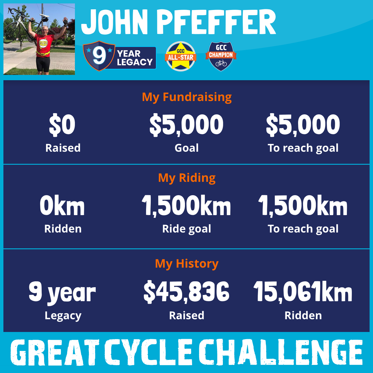 Most unfortunately I have to add my wife, Josee's, name to this. I now ride for her and my dear friend Marc. Josee was diagnosed in September 2024 with the most aggressive breast cancer, triple negative. She has been battling the disease ever since, principally with chemotherapy. Any prayers or good vibes you can send our way will be greatly appreciated. My best friend, Marc Rouleau, succumbed to cancer April 5, 2020. I don't have enough space here to tell you what a great person he was. Just an outstanding father, military leader, husband, professional. I'll continue to ride in Marc's memory this year. Neither was afflicted with a childhood cancer. I will continue to ride in support of the fight against childhood cancer. I think that's ok as what ever we can do to fight childhood cancer will help in the general fight against cancer. When you and I get a chance to speak please ask me about Marc and how Josee is doing.