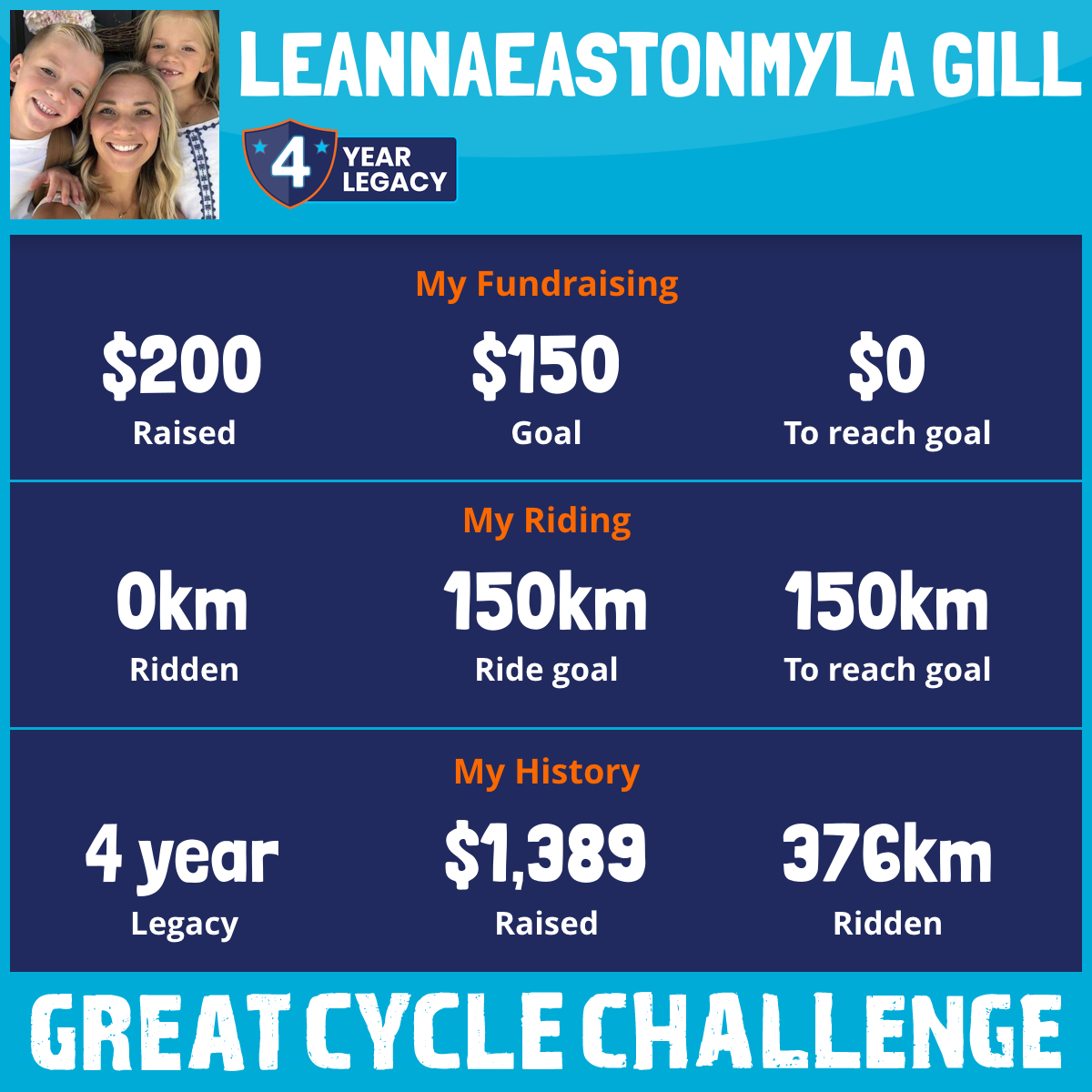 This August, Easton, Myla and I are taking part in the Great Cycle Challenge to fight kids' cancer! We will be biking over 150 kms in the month of August!
