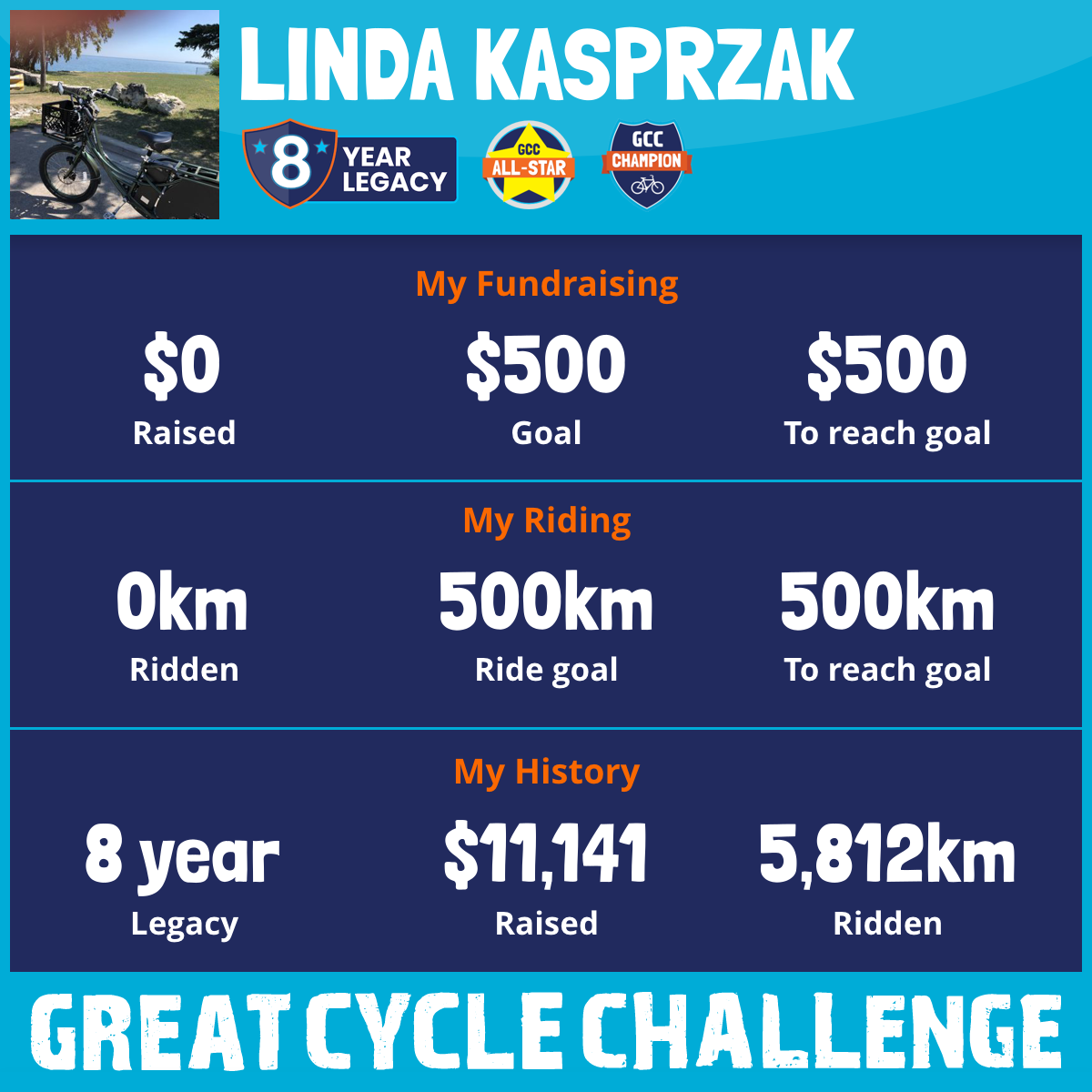 This August I ride again in the Great Cycle Challenge for the 8th year hoping that my contribution added to others will make a BIG difference.