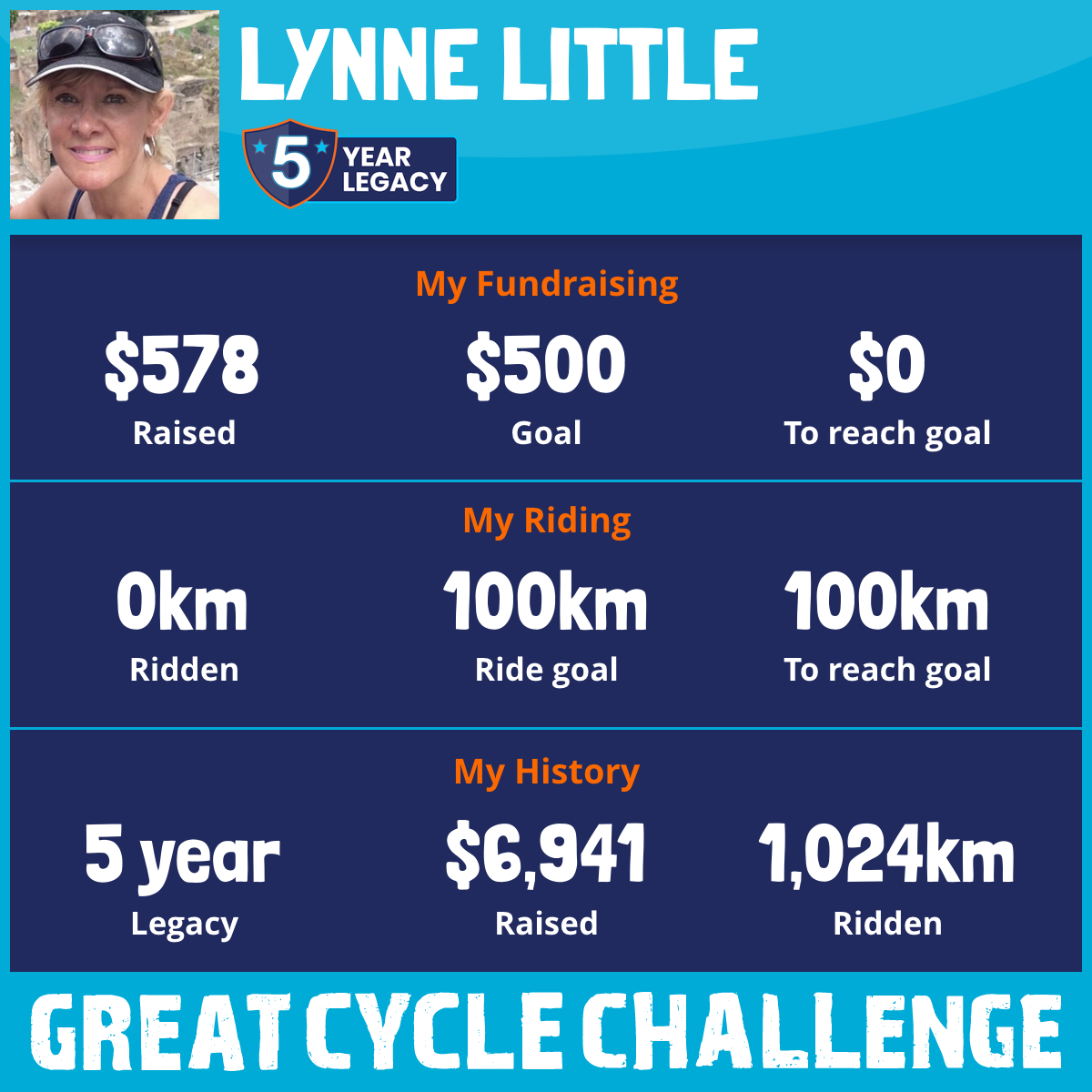 I am riding 100 km for cancer research since my husband Mark Little has been touch by cancer this year it means even more to me now.