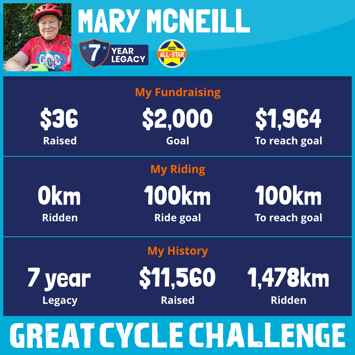 I would feel honoured to have your support. Check out my Great Cycle Challenge webpage https://greatcyclechallenge.ca/Riders/MaryMcNeill where you can follow my progress during August.