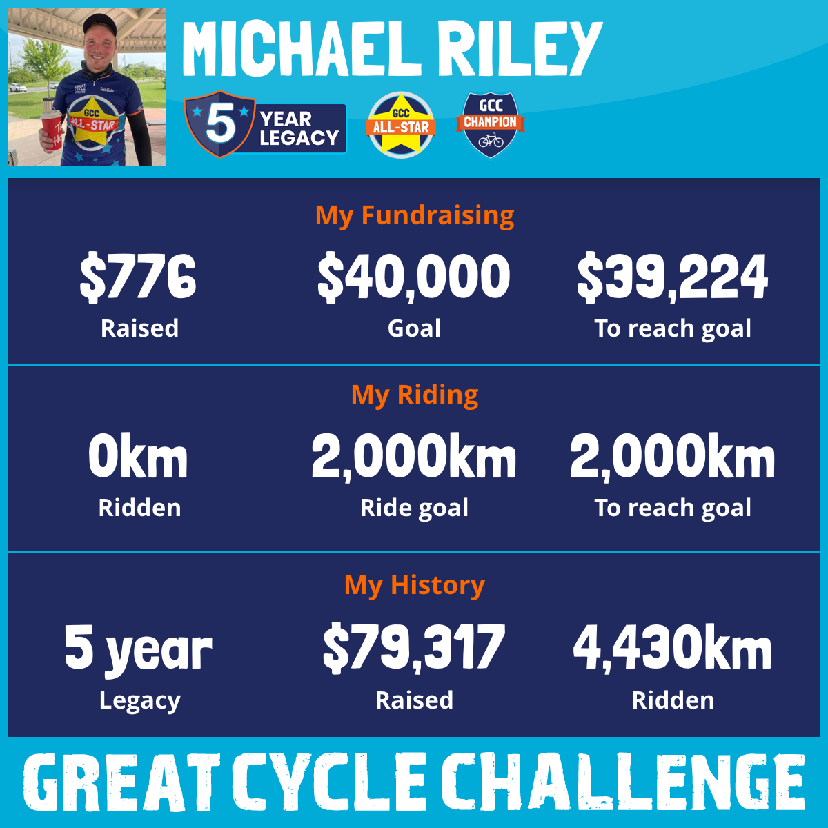 My name is Michael Riley, and I am honored to be participating in The Great Cycle Challenge for the fifth year, now as a Champion Rider!