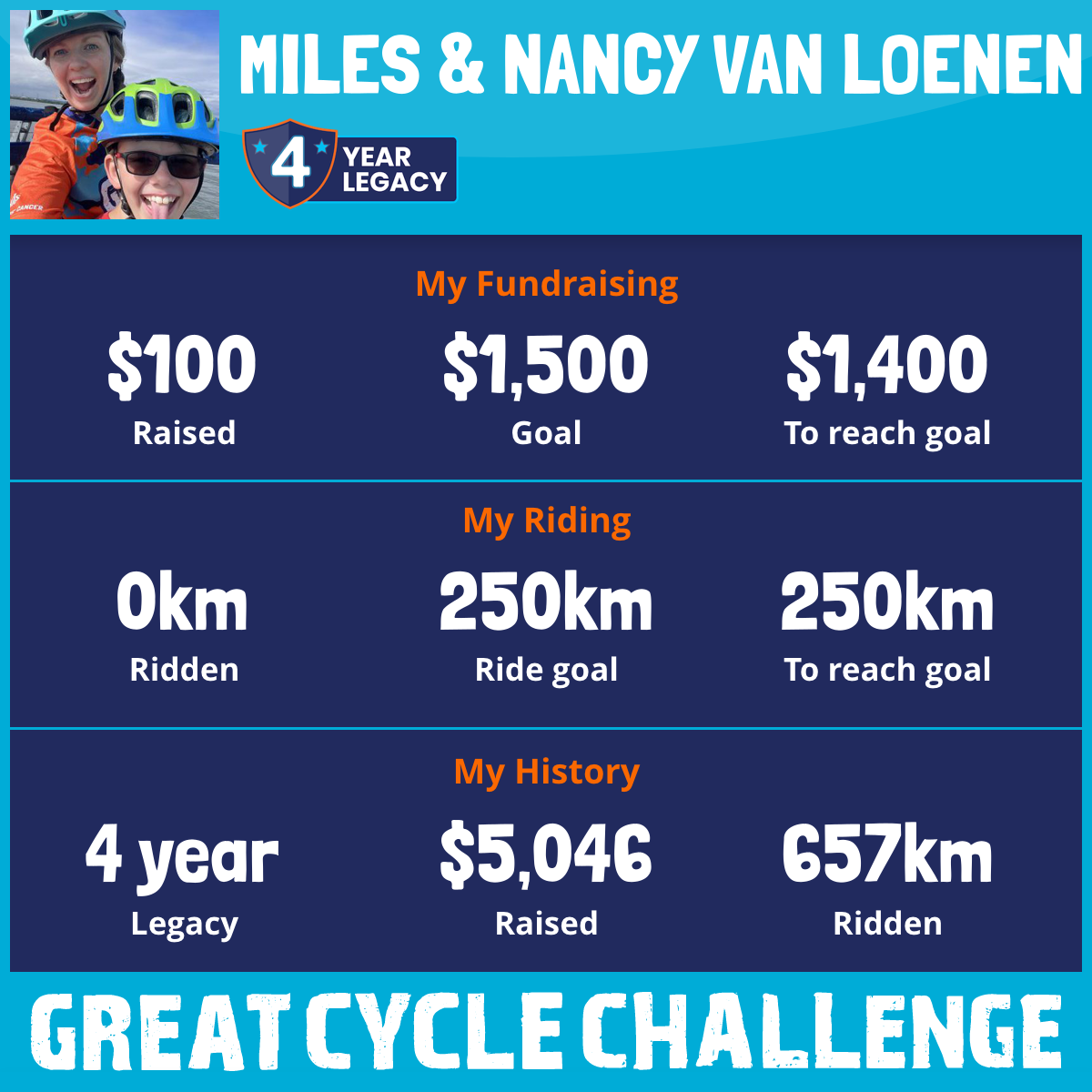 So far, we’ve logged 143 km and raised $1,176. Proud of Miles, grateful for the support, and excited to keep pedaling toward the finish line. Please share our mission with others!