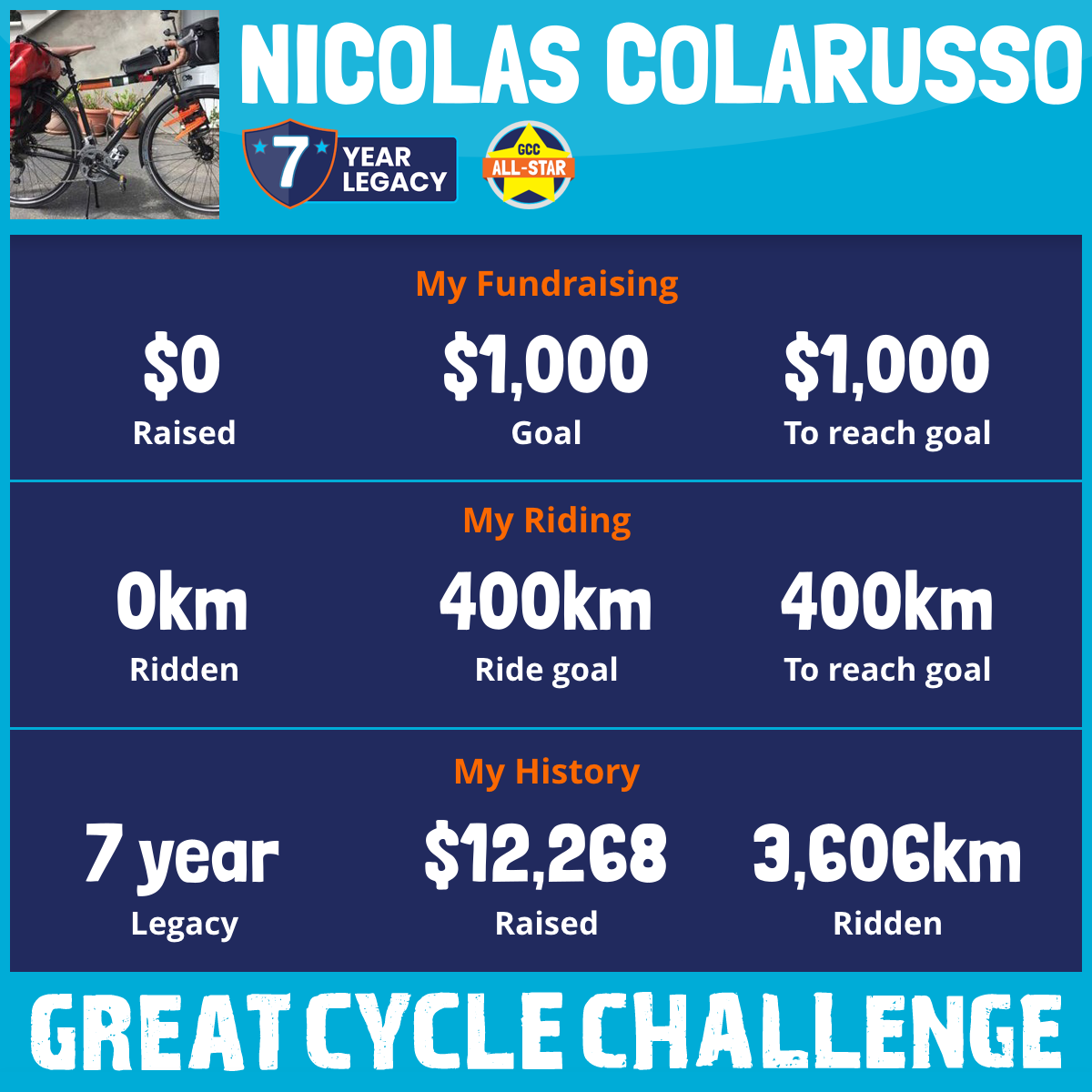 I am riding 400 km in memory of my dad, Antonio Colarusso (my dad). Please sponsor me and support my challenge to fight kids' cancer and save little lives.