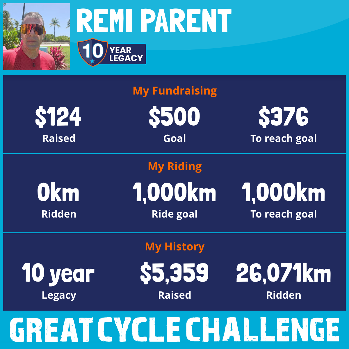 “Bonjour Rémi, Félicitations, avec ce don tu viens d'atteindre un nouvel objectif de 1000$ Bravo et bon vélo Jacques”