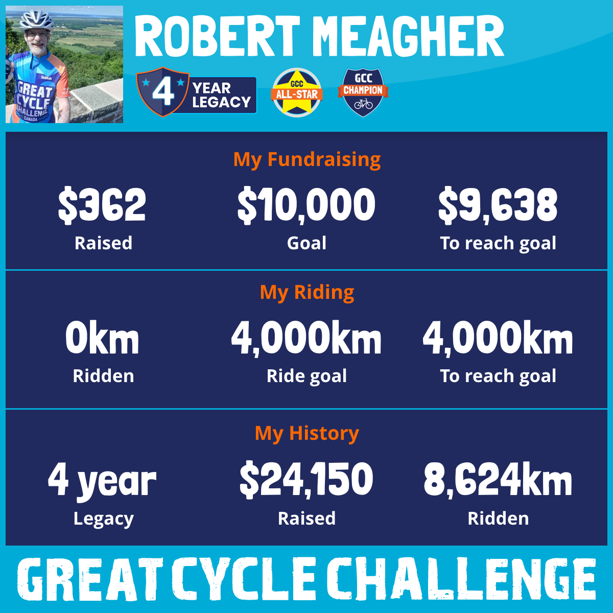 I am SO PLEASED to be back and participating in the 2026 edition of the Great Cycle Challenge (GCC)! This will be my 5th year participating in this remarkable event! I am raising funds through my GCC to support the SickKids Foundation efforts to develop treatments and, ultimately, find a cure for childhood cancer.