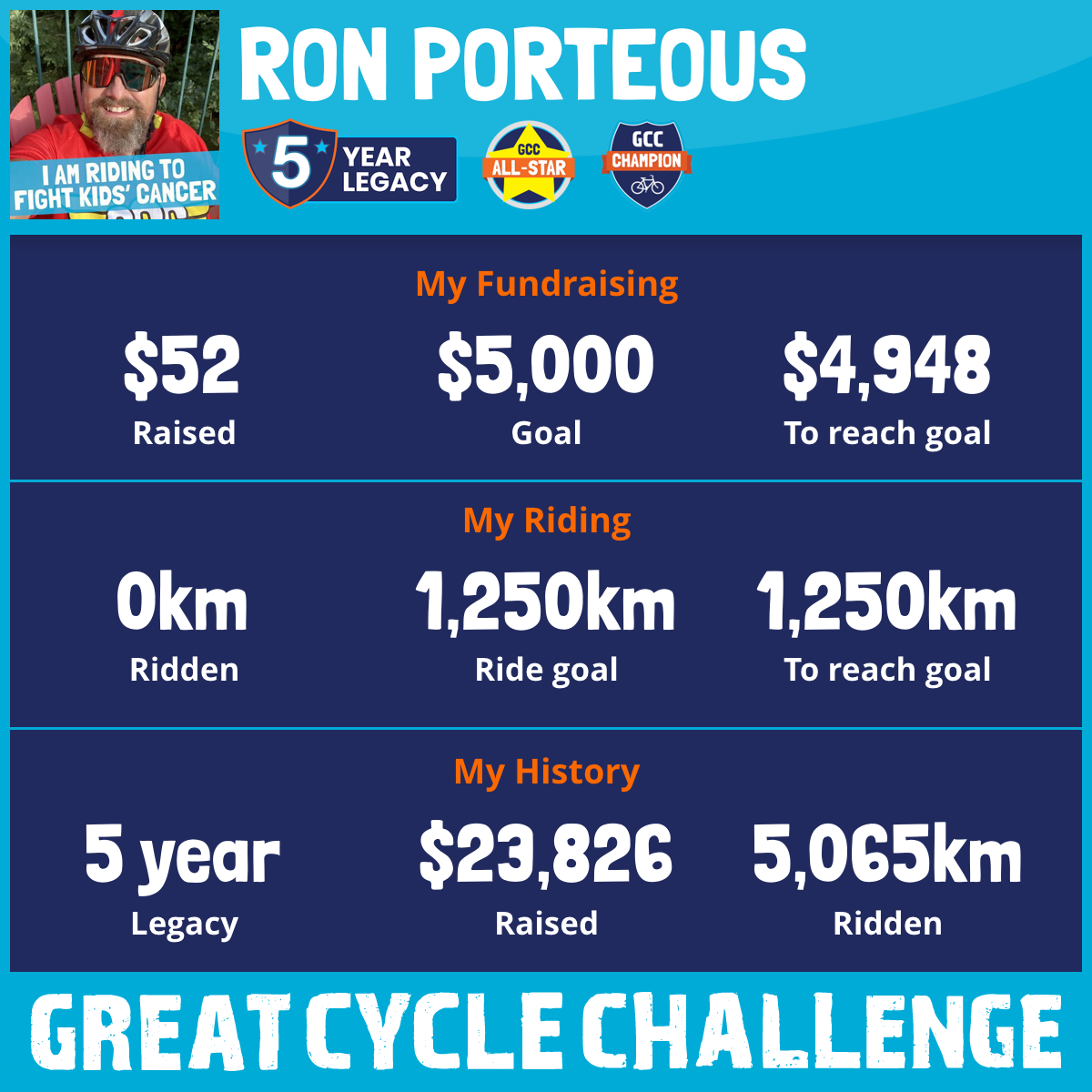 For the past five years, I have ridden in The Great Cycle Challenge which raises money for The Sick Kids Foundation and specifically to raise money to fight cancer in kids. In all of these years, my supporters have exceeded my expectations and have made this challenge so meaningful to me. Not only do I get to do something that I love but I get to do good for others while doing it. So far from 2021 through 2025, my supporters have donated $30,311 and I have ridden a total of 6414km during each August. I am keeping the same goals for 2026 which are, riding 1250km and collecting $5000 in donations. It's not easy, but I know you are all with me.