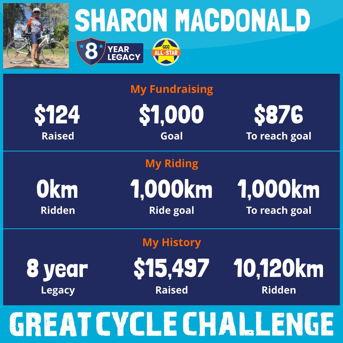 Once again I'm a proud participant in the Great Cycle Challenge Canada. This is my ninth year, my mission continues. Sadly the battle against childhood cancers is not over. I ride to support the kids, the little warriors. I ride to support SickKids Foundation and ensure they can continue their work in providing care, developing treatments and finding a cure for ALL childhood cancers. We also need to ensure these kids know they aren't alone in their battle. The Great Cycle Challenge riders are an 'army' across Canada fighting for them.