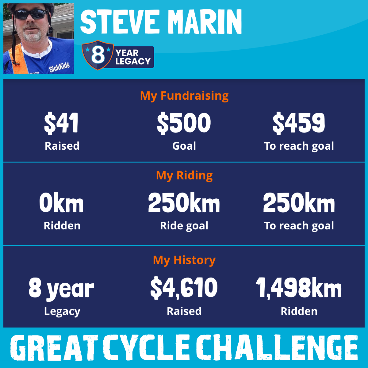 I am riding 250 km in memory of my dad, Rod Marin. Please sponsor me and support my challenge to fight kids' cancer and save little lives.