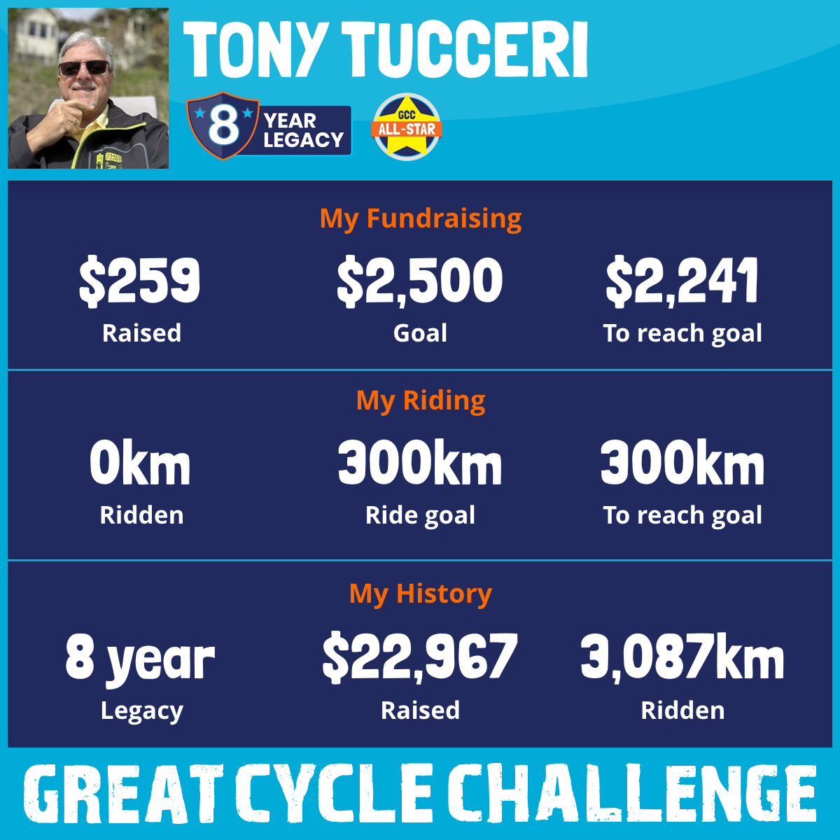 Having reached the wonderful age of 70, I am blessed, proud, and honoured to once again support the Great Canadian Cycle Challenge for the 8th year. I will ride a minimum of 300Km/187 miles during the month of August.